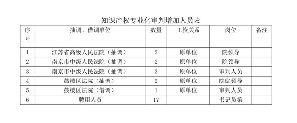 我院現有在職政法專項編制干警45人,退休人員8人,其他人員14人(長期聘用人員)。新增知識產權、行政審判職能后,我院沒有增加人員編制,在省、市、區三級法院的大力支持下,采取抽調、借調、招錄等方式組建知識產權專業化審判庭(詳見下表)。