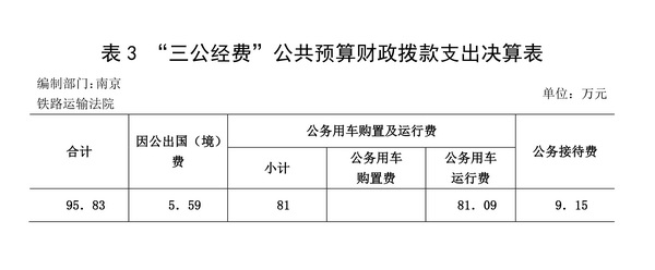 2013年,南京鐵路運輸法院部門“三公經費”公共預算財政撥款支出決算 95.83 萬元,其中:因公出國(境)費支出 5.59 萬元,占 6 %;公務用車購置及運行費支出 81.09萬元,占 85 %;公務接待費支出 9.15 萬元,占10 %。